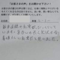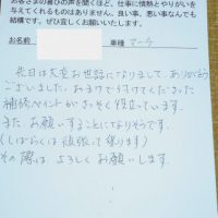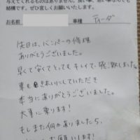 「早くて安くてとってもキレイで感激しました!」 ▼お客様の声 先日はバンパーの修理ありがとうございました。 早くて安くてとってもキレイで感激しました。 車もきれいにしていただき本当にありがとうございました。 大事に乗りま …