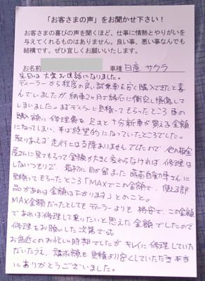 弘前市より板金塗装修理をさせていただいたお客様より感想を頂きました!