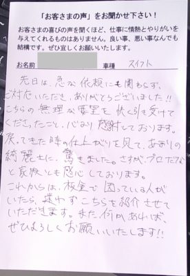 弘前市より板金塗装修理をさせていただいたお客様より感想を頂きました!